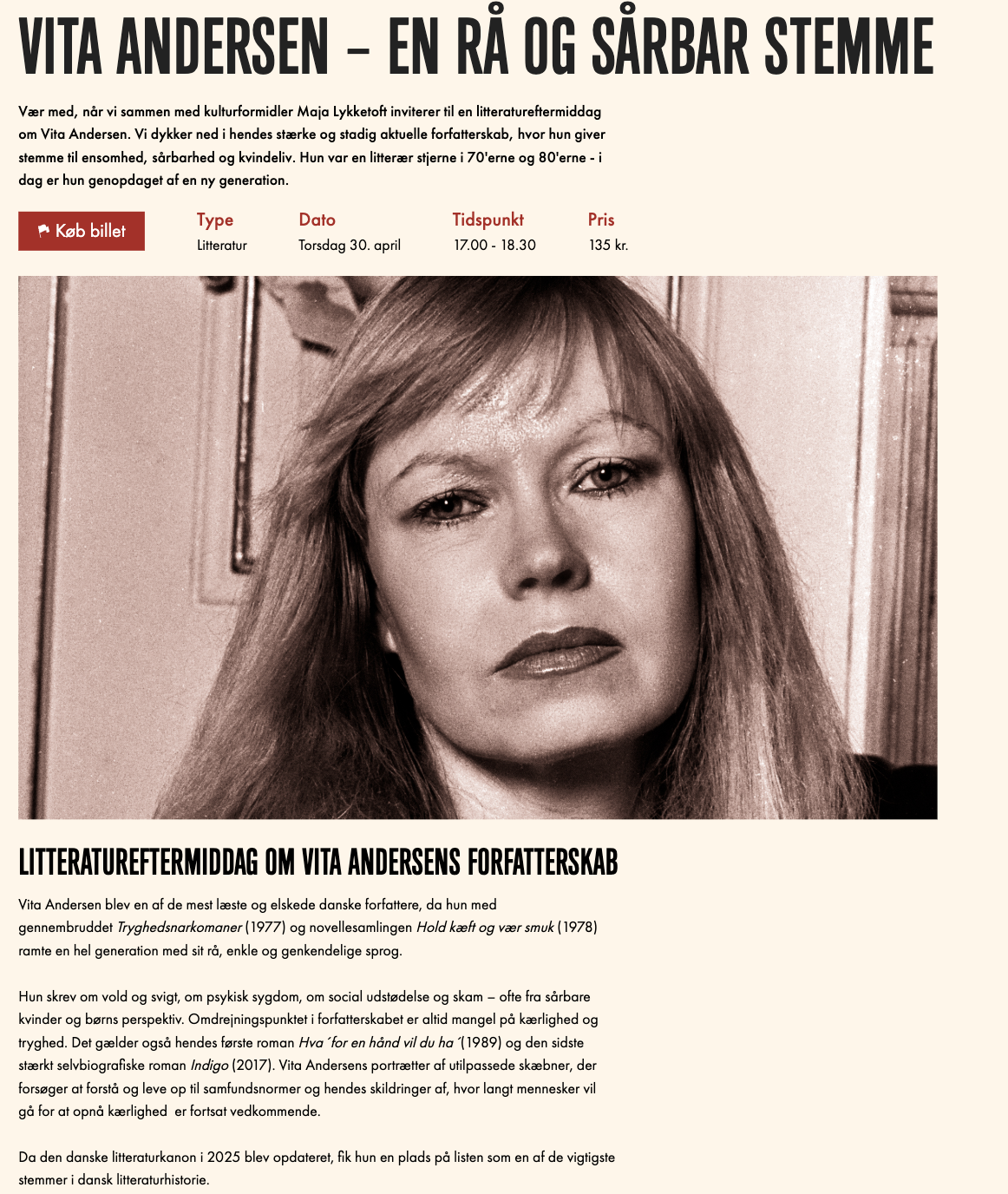 Tove Ditlevsen (1917-1976) drømte helt fra barnsben om at blive digter. Hun debuterede som 22- årig i 1939 med digtsamlingen Pigesind. Tove var født i en klassisk socialdemokratisk arbejderfamilie på Vesterbro. Et miljø, der kom til at påvirke Tove i hendes eget forfatterskab og i hendes syn på verden. Hendes folkelige gennembrud kom med hjemstavnsromanen Barndommens Gade, hvor hun med inspiration i egen barndom og med sympati for børnenes ret og tarv skrev enkelt, sårbart og præcist fra barnets perspektiv.
